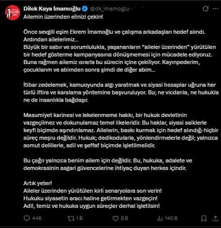 Önce sevgili eşim Ekrem İmamoğlu ve çalışma arkadaşları hedef alındı. Ardından ailelerimiz… Büyük bir sabır ve sorumlulukla, yaşananların “aileler üzerinden” yürütülen bir hedef gösterme kampanyasına dönüşmemesi için mücadele ediyoruz. Buna rağmen ailemiz ısrarla bu sürecin içine çekiliyor. Kayınpederim, çocuklarım ve abimden sonra şimdi de diğer abim…
