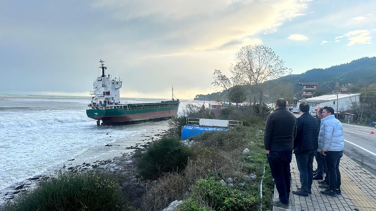 İnebolu ilçesinde fırtına nedeniyle Kamboçya bayraklı "Vamos" adlı kuru yük gemisi kıyıya sürüklendi.