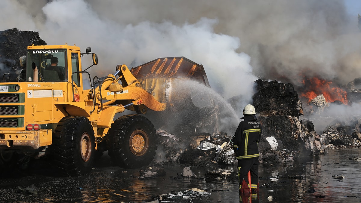 Kayseri'de bir keçe fabrikasında çıkan yangına müdahale ediliyor.