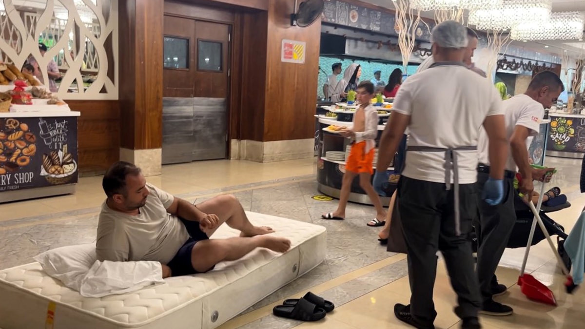 Cenk Bilge paylaşımında, "Otelin en serin yeri restoran olduğu için yatağı buraya getirdim. Otelde dün geceden beri klimalar bozuk, bağıran çağıran bir Rus turiste oda verdiler. Ben, 'Tamam tamam' dedikçe sessiz kaldılar. Saatlerdir bir yetkili ile konuşmak istiyorum, yok dediler. Ben de yemekhaneye yatak attım. Bütün yetkililer genel müdür dahil başıma toplantı. Videosunu paylaşacağım. Konuya çözüm üretmediler. Benim son günüm olduğu için sabrettim, ilk gün olsa çoktan çıkmıştım. Gece 23.30'ta başlayan problem bir sonraki gün 20.00'de çözüldü" dedi.