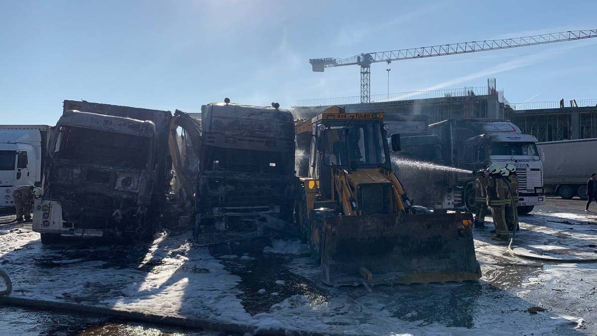 Kısa sürede kontrol altına alınan yangın, korku dolu anlar yaşattı. Yangının ardından 3 TIR ve 1 kamyon kullanılmaz hale geldi. (DHA)