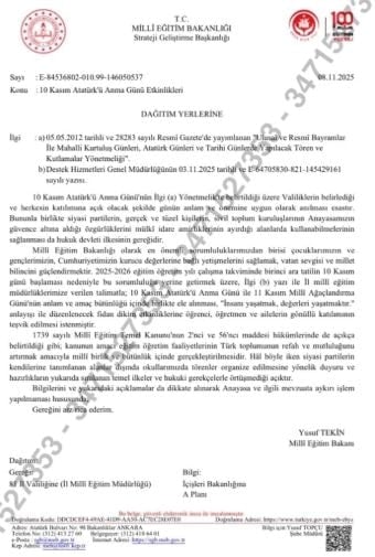 “Çeşitli basın organlarında ve sosyal medya mecralarında, ‘Millî Eğitim Bakanlığının 10 Kasım’da okullarda Atatürk’ü anmayı yasakladığı ve ‘kapıları kilitleyin’ talimatı verdiği’ şeklinde yer alan iddialar dezenformasyon içermektedir. Millî Eğitim Bakanlığı’nın 8 Kasım tarihli yazısında, 10 Kasım Atatürk’ü Anma Günü’nün ilgili yönetmelik uyarınca valiliklerin belirlediği ve herkesin katılımına açık alanlarda, günün anlam ve önemine uygun şekilde anılmasının esas olduğu belirtilmektedir. Yazıda Atatürk’ü anma etkinliklerinin yasaklanmasına ilişkin herhangi bir ifade bulunmamaktadır; ancak siyasi partilerin kendilerine tanımlanan alanlar dışında okullarda tören veya organizasyon çağrısı yapmalarının mevzuata uygun olmadığı vurgulanmaktadır. Ayrıca söz konusu yazıda, 11 Kasım Millî Ağaçlandırma Günü çerçevesinde öğrenci, öğretmen ve ailelerin gönüllü katılımıyla fidan dikim etkinlikleri düzenlenmesinin teşvik edilmesi istenmektedir. Bu etkinlik kapsamında tüm eğitim kademelerinde öğrenciler Atatürk’e ve vatan sevgisine ilişkin duygu ve düşüncelerini yansıtan mesaj kartları hazırlayarak diktikleri fidanlara yerleştireceklerdir.