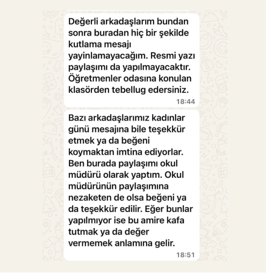 Ayrıca benzer baskıların daha önce de yaşandığı, müdürün ders sırasında mesajlara geç bakılması gerekçesiyle öğretmenleri azarlayıp mobbing yaptığı da iddia edildi.
