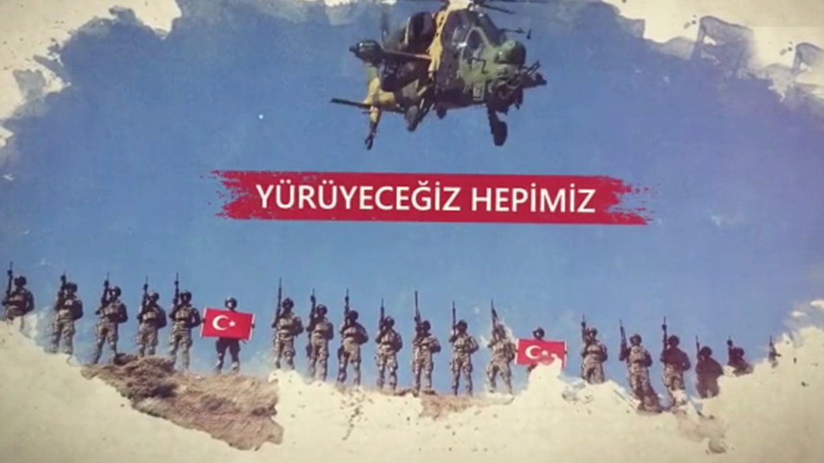 Kurtuluş Savaşı'ndan günümüze Türkiye'deki ve Türk ordusunun katettiği mesafeye ilişkin görüntüler, 100. Yıl Marşı'ndan "Özgürlük tutkusu damarlarımda/ Çelikten her nefer semalarımda / Sarmaşık dal gibi sarılmışız biz bize/ Tek yürek bu millet en zor anında." dizeleriyle verildi.