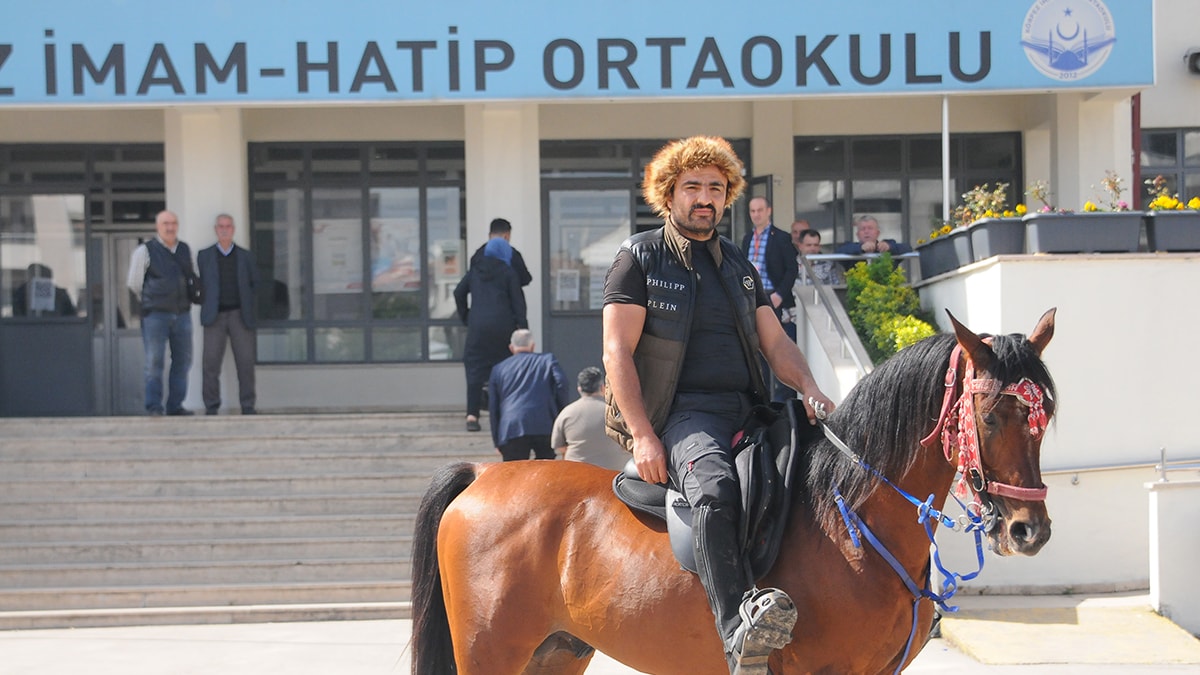 Körfez ilçesinde yaşayan oto tamirci Summani Yılmaz, oy kullanacağı Körfez İmam Hatip Ortaokulu'na 3 yaşındaki atı 'Rüzgar' ile geldi. Yılmaz'ı at üstünde görenler şaşırırken, bazıları 'Rüzgar'ın yanına gidip başını okşadı.