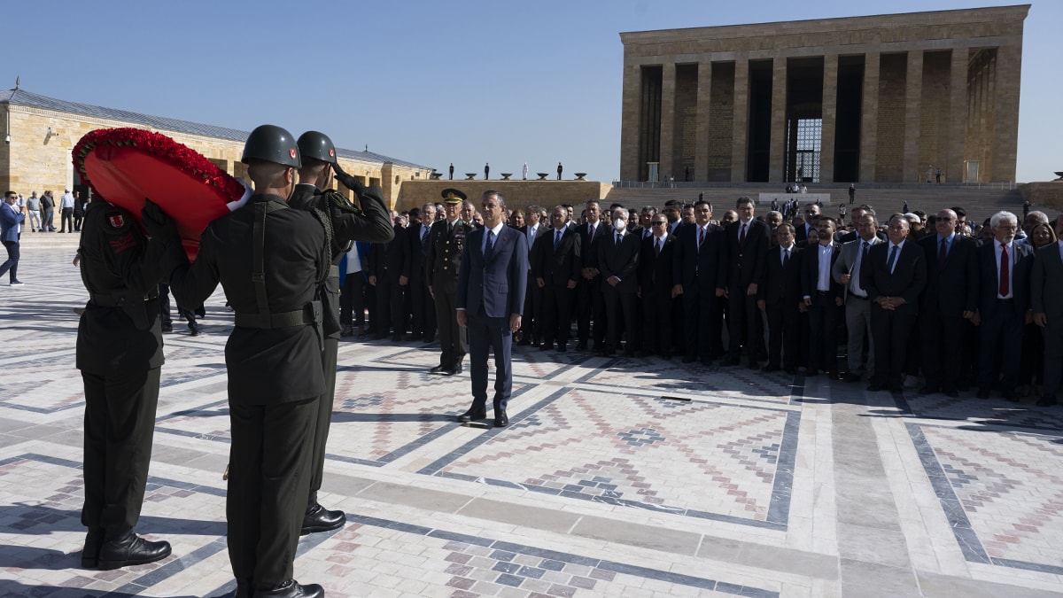 Özgür Özel'in mozoleye çelenk bırakmasının ardından saygı duruşunda bulunuldu.