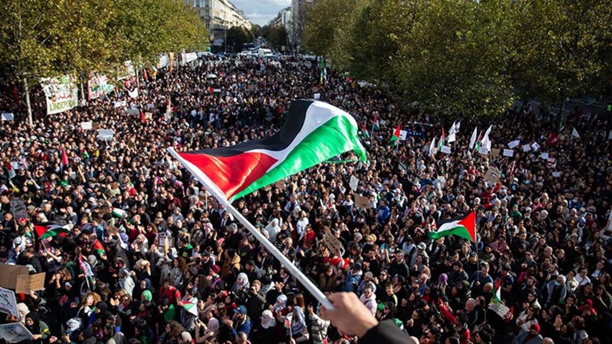 İşçi sendikalarının çağrısıyla Paris'teki Cumhuriyet Meydanı'nda bir araya gelen göstericiler, İsrail-Filistin çatışmasının bitmesini talep etti.