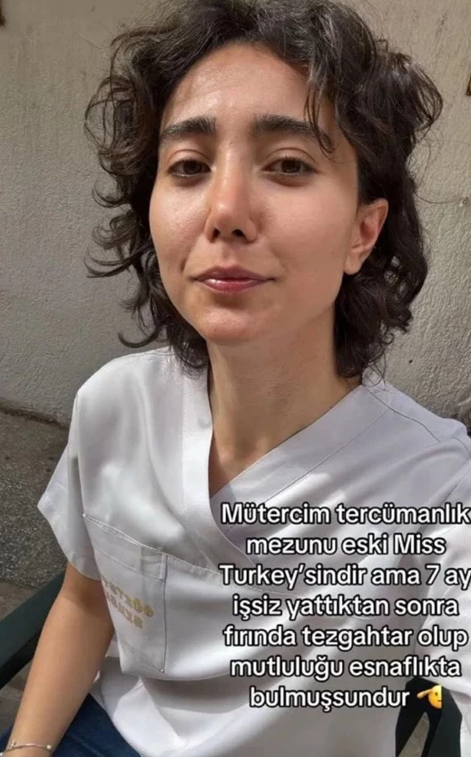 Öztaş, paylaşımına “Mütercim tercümanlık mezunu eski Miss Turkey'sindir. Ama 7 ay işssiz yattıktan sonra fırında tezgahtar olup mutluluğu esnaflıkta bulmuşsundur” notunu düştü.
