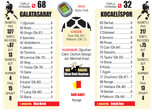 Süper Lig’de son 6 haftaya lider giren Galatasaray, Kocaelispor karşısında şoke oldu. Sarı-kırmızılılar, demeç savaşlarına dönen mücadelede oldukça zorlandı. Temponun düşük olduğu ilk yarıda, perdeyi açan Leroy Sane oldu.