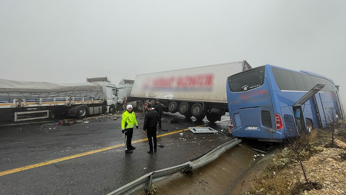 Yoğun sisin ve yağmurun etkili olduğu Şanlıurfa-Gaziantep otoyolu bağlantı yolunda 34 FVK 835 plakalı yolcu otobüsüyle aynı yöne seyir halindeki 67 AK 846 ve 33 DES 29 plakalı tırlar çarpıştı.