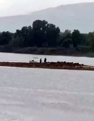 Görüntülerde, suyun çekilmesi ile gün yüzüne çıkan tarihi yapının üzerindeki 3 kişi net şekilde yer aldı.