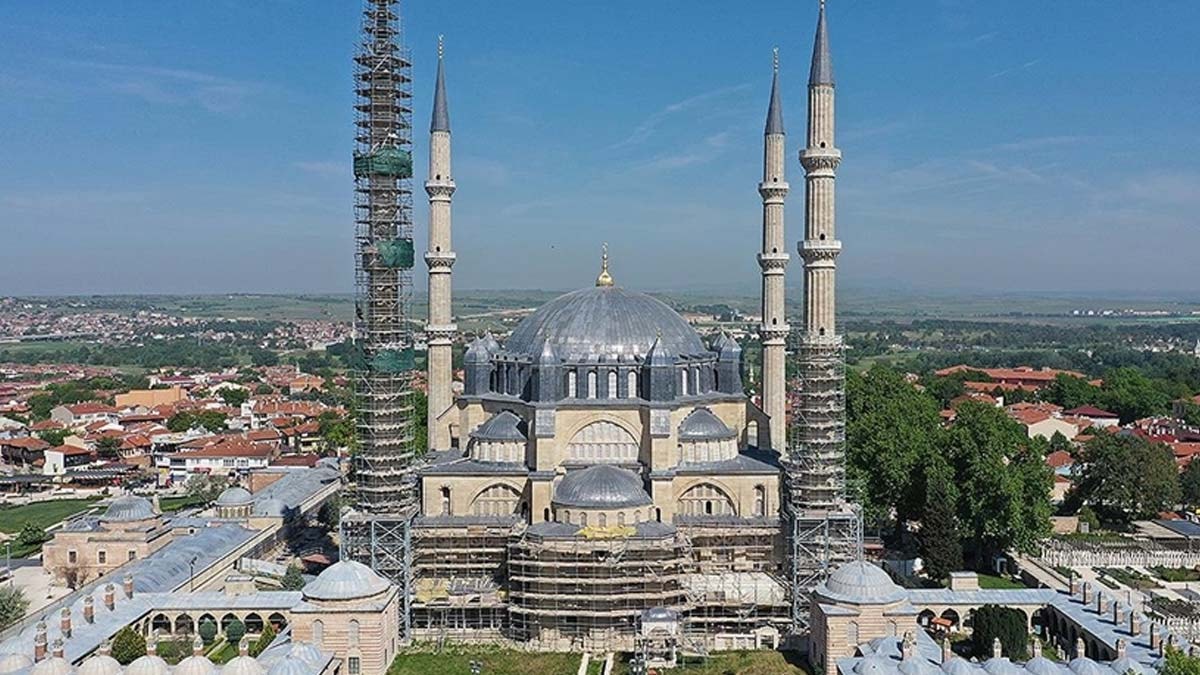 Kalem gibi ince, bir dantel gibi süslü, 3 yollu olarak tasarlandığı için merdivenlerden çıkan 3 kişinin birbirini göremediği 3 şerefeli, alemi dahil 85 metre uzunluğunda dört minareden üçündeki işlemler tamamlandı.