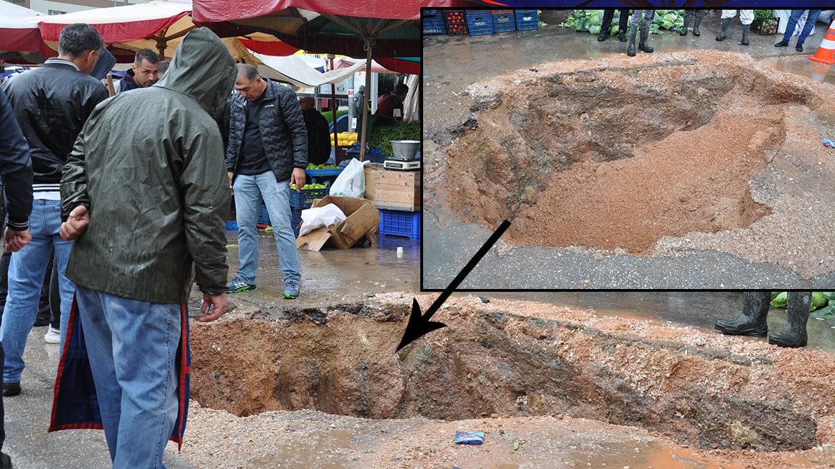 Yaklaşık 2 metre çapında, 1,5 metre derinliğindeki çukur dolayısıyla esnaf tezgahını açamadı.