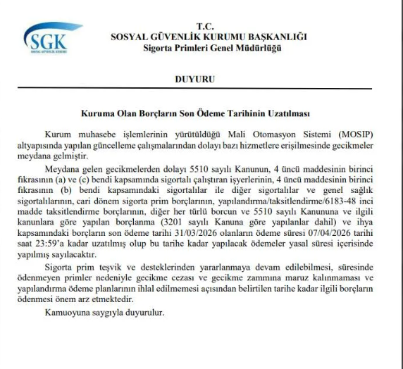 Meydana gelen gecikmelerden dolayı 5510 sayılı Kanunun, 4 üncü maddesinin birinci fıkrasının (a) ve (c) bendi kapsamında sigortalı çalıştıran işyerlerinin, 4 üncü maddesinin birinci fıkrasının (b) bendi kapsamındaki sigortalılar ile diğer sigortalılar ve genel sağlık sigortalılarının, cari dönem sigorta prim borçlarının, yapılandırma/taksitlendirme/6183-48 inci madde taksitlendirme borçlarının, diğer her türlü borcun ve 5510 sayılı Kanununa ve ilgili kanunlara göre yapılan borçlanma (3201 sayılı Kanuna göre yapılanlar dahil) ve ihya kapsamındaki borçların son ödeme tarihi 31/03/2026 olanların ödeme süresi 07/04/2026 tarihi saat 23:59’a kadar uzatılmış olup bu tarihe kadar yapılacak ödemeler yasal süresi içerisinde yapılmış sayılacaktır.