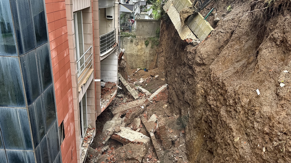 Ada Mahallesi Esen Sokak'ta 7 katlı bir binanın arka tarafında bulunan istinat duvarı şiddetli yağış nedeniyle yıkıldı.