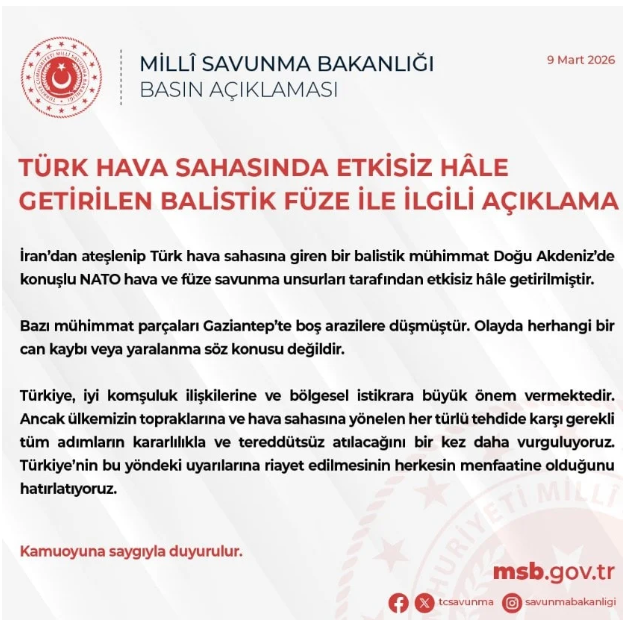 "Türk Hava Sahasında Etkisiz Hâle Getirilen Balistik Füze İle İlgili Açıklama İran’dan ateşlenip Türk hava sahasına giren bir balistik mühimmat, Doğu Akdeniz’de konuşlu NATO hava ve füze savunma unsurları tarafından etkisiz hâle getirilmiştir. Bazı mühimmat parçaları Gaziantep’te boş arazilere düşmüştür. Olayda herhangi bir can kaybı veya yaralanma söz konusu değildir. Türkiye, iyi komşuluk ilişkilerine ve bölgesel istikrara büyük önem vermektedir. Ancak ülkemizin topraklarına ve hava sahasına yönelen her türlü tehdide karşı gerekli tüm adımların kararlılıkla ve tereddütsüz atılacağını bir kez daha vurguluyoruz. Türkiye’nin bu yöndeki uyarılarına riayet edilmesinin herkesin menfaatine olduğunu hatırlatıyoruz. Kamuoyuna saygıyla duyurulur."