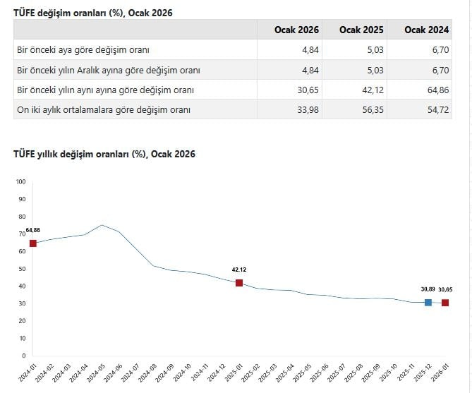 TÜFE'deki (2025=100) değişim 2026 yılı Ocak ayında bir önceki aya göre %4,84 artış, bir önceki yılın Aralık ayına göre %4,84 artış, bir önceki yılın aynı ayına göre %30,65 artış ve on iki aylık ortalamalara göre %33,98 artış olarak gerçekleşti.