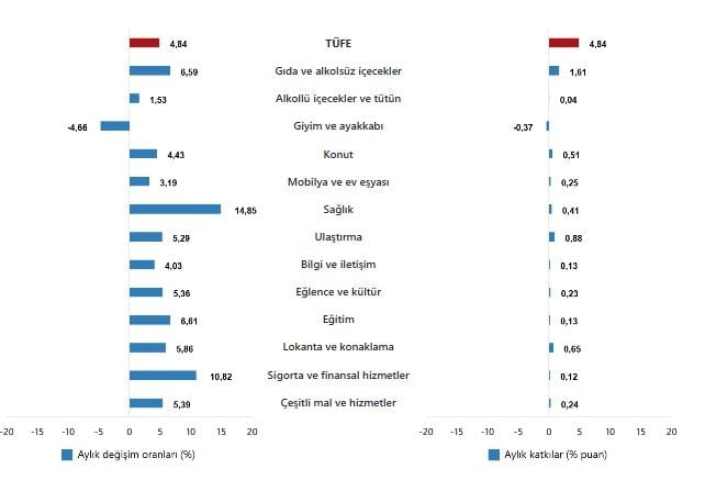 En yüksek ağırlığa sahip üç ana harcama grubunun aylık değişimleri; gıda ve alkolsüz içeceklerde %6,59 artış, ulaştırmada %5,29 artış ve konut, su, elektrik, gaz ve diğer yakıtlarda %4,43 artış olarak gerçekleşti. İlgili ana grupların aylık değişime olan katkıları ise gıda ve alkolsüz içeceklerde 1,61, ulaştırmada 0,88 ve konutta 0,51 yüzde puan oldu. (Ana harcama gruplarına göre endeksler, ağırlıklar ve değişim oranları Ek Tablo-1'de, ana harcama gruplarının genel endeksteki aylık ve yıllık değişime olan katkıları Ek Tablo-3'tedir).