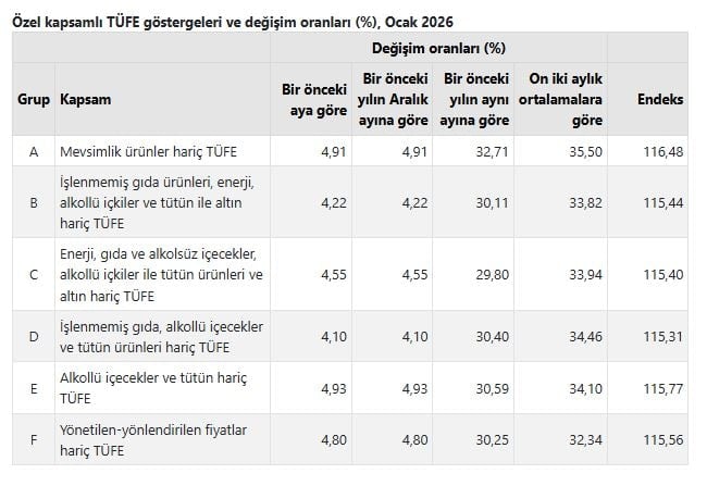 İşlenmemiş gıda ürünleri, enerji, alkollü içkiler ve tütün ile altın hariç TÜFE'deki değişim, 2026 yılı Ocak ayında bir önceki aya göre %4,22 artış, bir önceki yılın Aralık ayına göre %4,22 artış, bir önceki yılın aynı ayına göre %30,11 artış ve on iki aylık ortalamalara göre %33,82 artış olarak gerçekleşti.