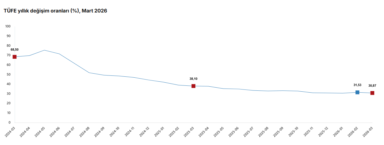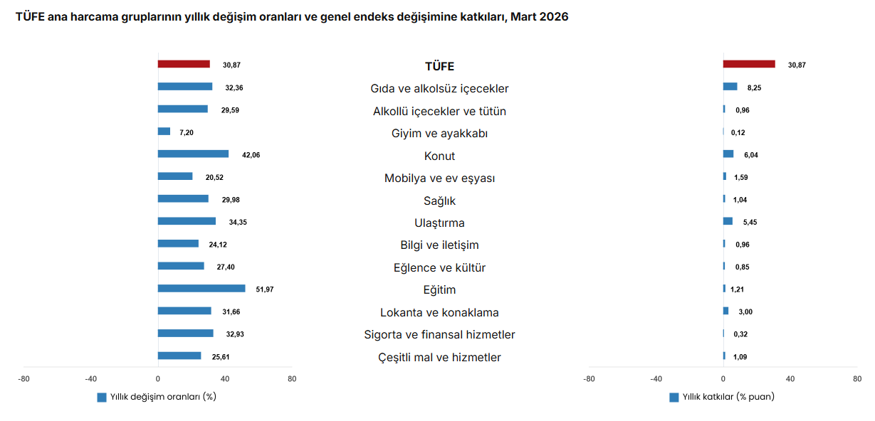 TÜFE’deki değişim, 2025 yılı baz alınarak hesaplandığında Mart 2026’da bir önceki aya göre yüzde 1,94, bir önceki yılın Aralık ayına göre yüzde 10,04, bir önceki yılın aynı ayına göre yüzde 30,87 ve on iki aylık ortalamalara göre yüzde 32,82 olarak gerçekleşti.