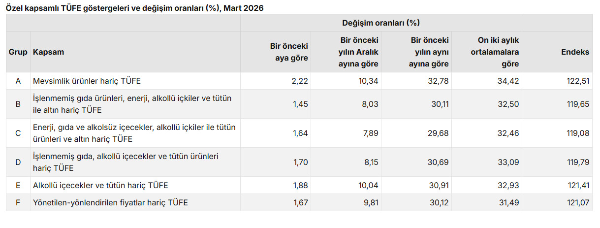 İşlenmemiş gıda ürünleri, enerji, alkollü içkiler, tütün ve altın hariç TÜFE göstergesi (B) Mart 2026’da şu şekilde gerçekleşti: