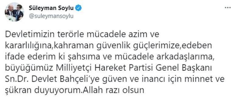 Soylu, sosyal medya hesabından yaptığı açıklama ile Bahçeli'ye teşekkür ederek, “Devletimizin terörle mücadele azim ve kararlılığına, kahraman güvenlik güçlerimize, edeben ifade ederim ki şahsıma ve mücadele arkadaşlarıma, büyüğümüz Milliyetçi Hareket Partisi Genel Başkanı Sayın Dr. Devlet Bahçeli'ye güven ve inancı için minnet ve şükran duyuyorum. Allah razı olsun” ifadelerini kullandı.