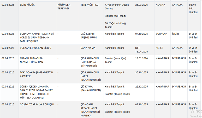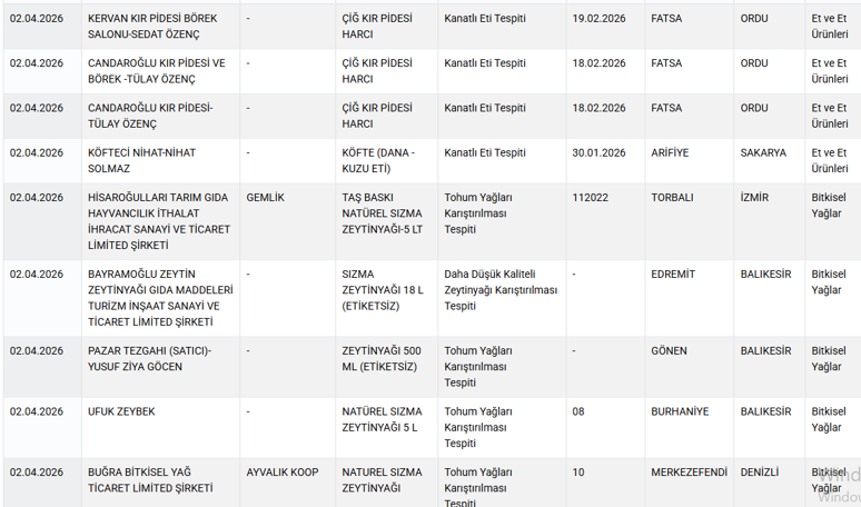 Açıklanan listede yer alan ürünlerin, günlük yaşamda sıkça tüketilen gıdalar arasında bulunması dikkat çekti. Kıyma, köfte, tereyağı ve zeytinyağı gibi temel besinlerde tespit edilen hileler tüketicilerde kaygı oluşturdu. Yapılan incelemelere göre;