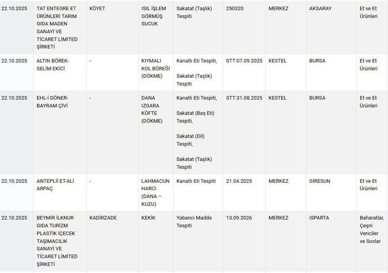 Türkiye genelinde yapılan kapsamlı denetimlerin ardından Tarım ve Orman Bakanlığı bir kez daha harekete geçti. Bakanlık, taklit ve tağşiş yapan firmaları ifşa listesine ekleyerek, vatandaşları sağlıksız ürünlere karşı uyardı. Son açıklamada özellikle köfte, sucuk, baharat ve tarhana gibi sık tüketilen ürünlerde ciddi usulsüzlükler ortaya çıktı.