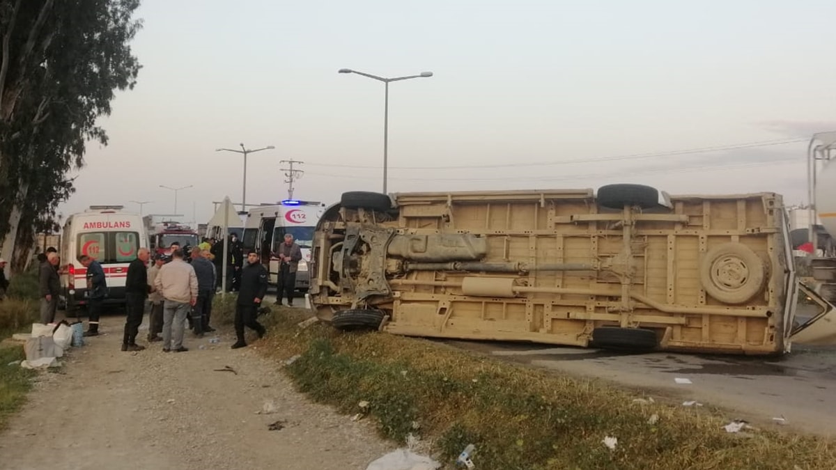 Çarpışmanın etkisiyle devrilen minibüsteki 6 tarım işçisi yaralandı.