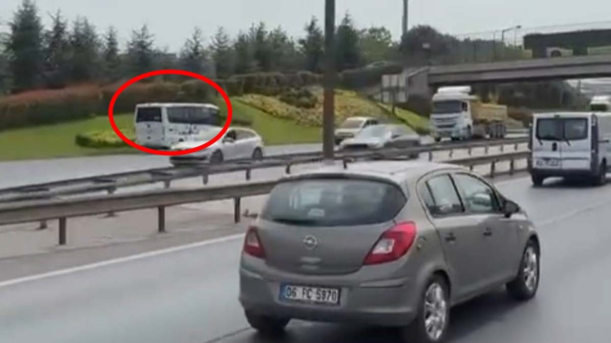 Emniyet şeridindeki midibüs sürücüsü, karşı yönden gelen araçlara aldırış etmeden kilometrelerce ters yönde ilerledi. Midibüs sürücüsü emniyet şeridinde hızla gittiği sırada hem kendi hayatını hem de diğer sürücüleri tehlikeye attı.