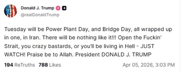 Trump sosyal medya platformu Truth Social hesabından yaptığı paylaşımda, salı günü itibarıyla İran'a ait köprü ve enerji santrallerini hedef alacaklarını ve en büyük yapılardan saldırıya başlayacaklarını belirten Trump, "Salı günü İran’da enerji santralleri günü ve köprüler günü olacak; hepsi bir arada gerçekleşecek. Bunun bir benzeri olmayacak! O s****min boğazını açın deli p*çler, yoksa cehennemi yaşarsınız. Sadece izleyin! Allah'a hamdolsun"