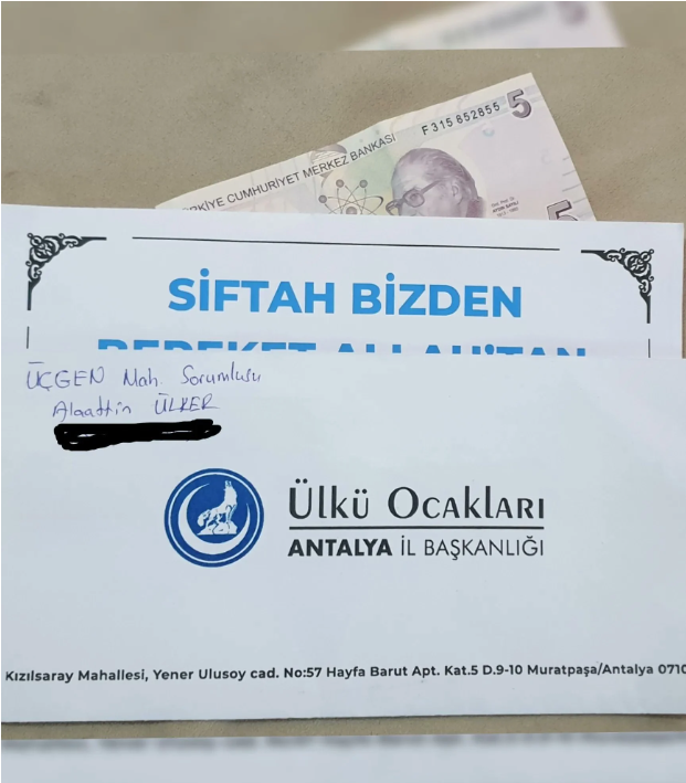 Tepkilere neden olan, Ülkü Ocakları Antalya İl Başkanlığı imzalı zarflarda paranın yanı sıra bir mesaj da yer aldı.