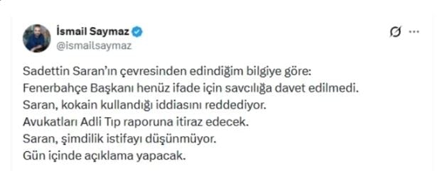 Gazeteci İsmail Saymaz’ın aktardığı bilgilere göre Sadettin Saran, Fenerbahçe Başkanlığı görevinden ayrılmayacağını ve istifa etmeyeceğini yakın çevresine bildirdi.
