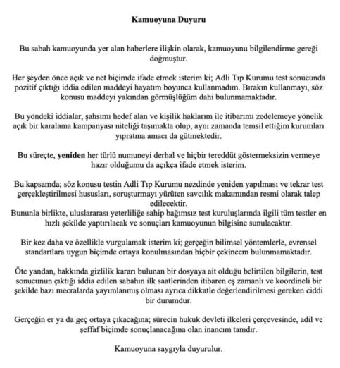 "Her şeyden önce açık ve net biçimde ifade etmek isterim ki; Adli Tıp Kurumu test sonucunda pozitif çıktığı iddia edilen maddeyi hayatım boyunca kullanmadım. Bırakın kullanmayı, söz konusu maddeyi yakından görmüşlüğüm dahi bulunmamaktadır.