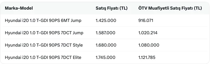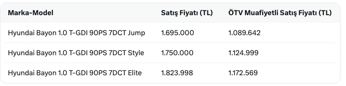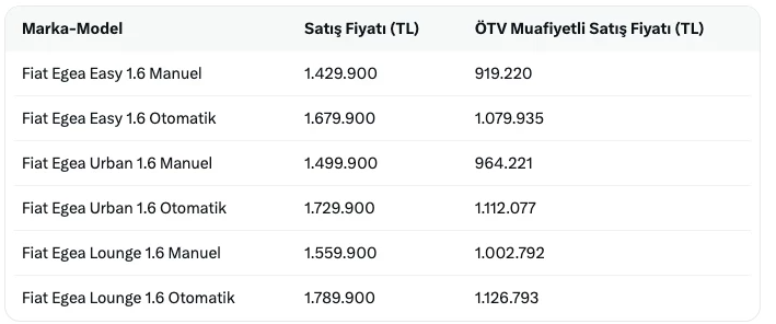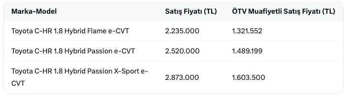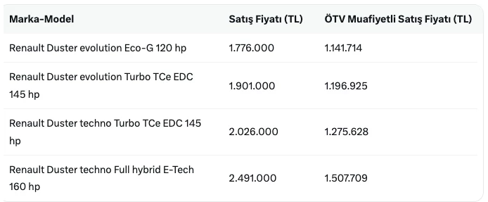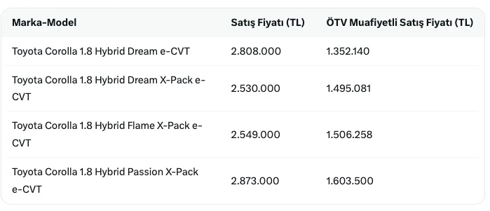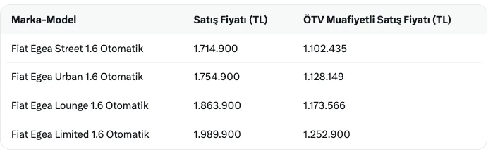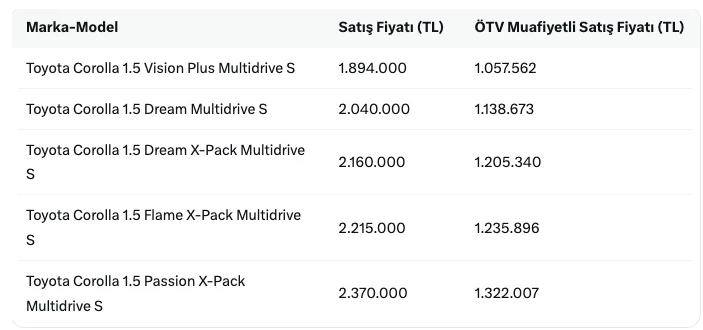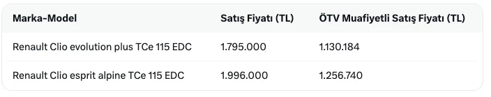Yüzde 40 yerlilik şartı getirilen düzenleme kapsamında ÖTV’siz alınabilecek araçlar arasında Togg T10X ve T10F, Fiat Egea Sedan ve Egea Cross, Renault Clio, Megane Sedan ve Duster, Toyota Corolla, Corolla Hybrid ve C-HR ile Hyundai i20 ve Bayon modelleri yer aldı.