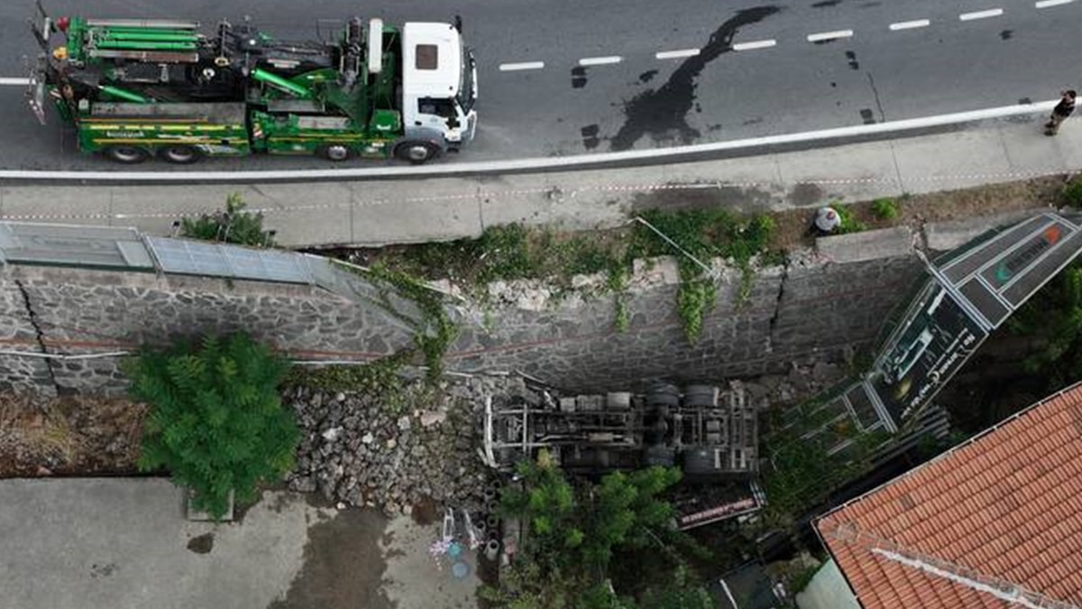 Ekiplerin, bahçeye düşen kamyoneti bulunduğu yerden kaldırma çalışması sürüyor.