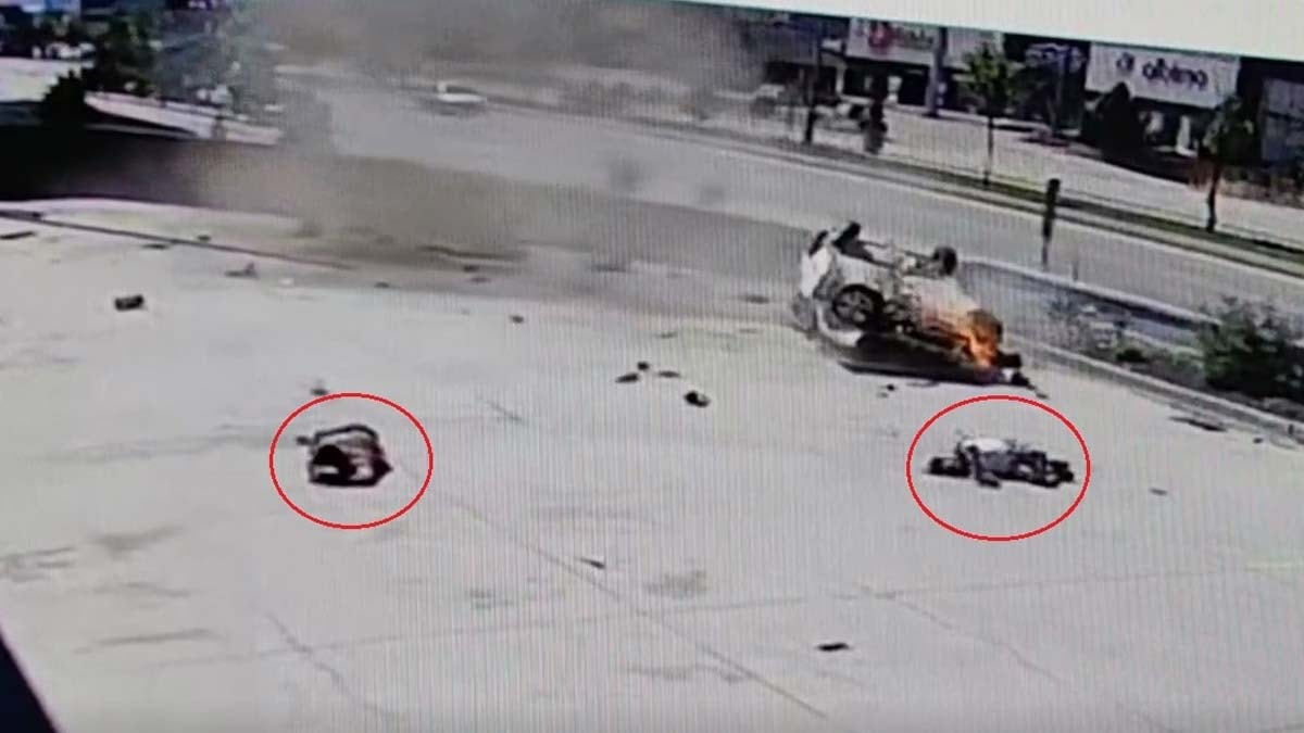 Alev alan araçtan fırlayan 2 kişi metrelerce savrularak yere düşerken, ters dönerek duran otomobildeki Kemal C. de emekleyerek çıktı. O anlar, bir iş yerinin güvenlik kamerasına saniye saniye yansıdı. Fabrikanın bekçisi ile çevredekiler yaralıların yardımına koşarken, ihbarla olay yerine polis, itfaiye ve sağlık ekipleri sevk edildi.