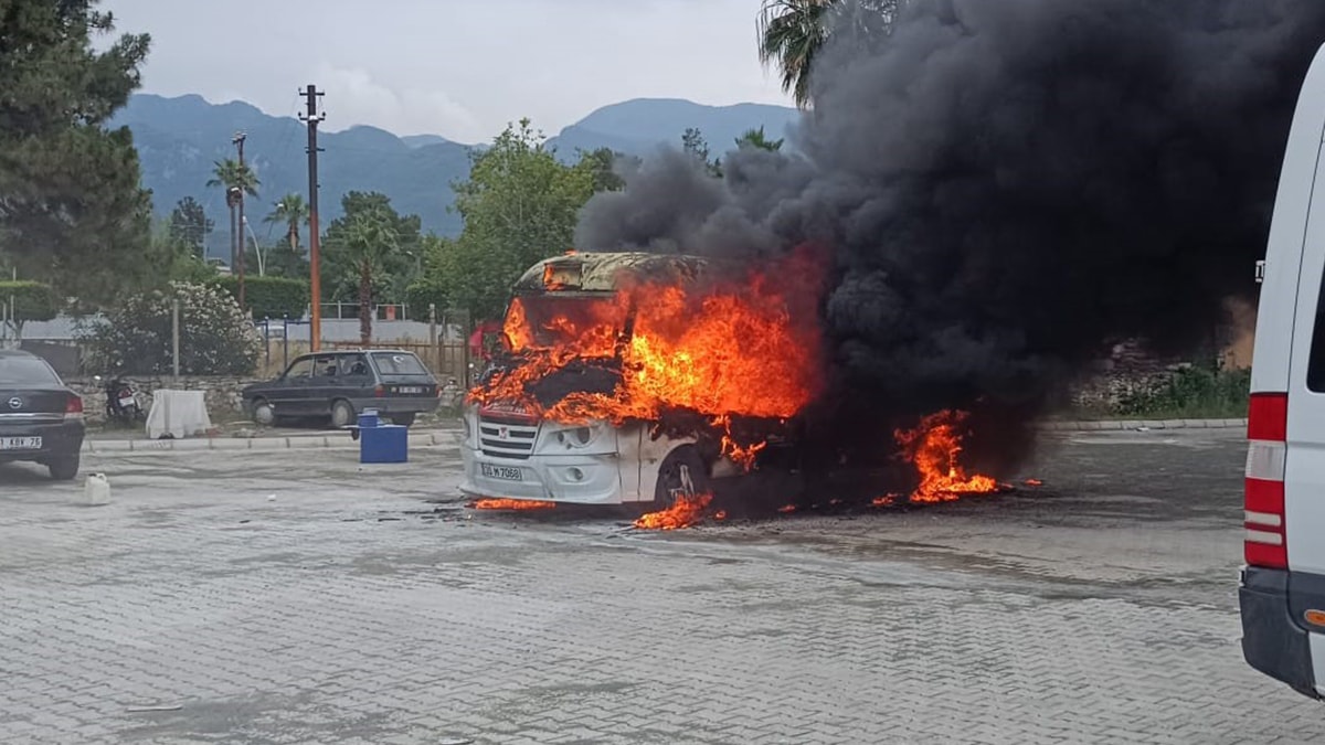 Numune Evler Mahallesi'ndeki şehir içi dolmuş durağında A.A. idaresinde sefere hazırlanan 31 M 7068 plakalı minibüs, bilinmeyen nedenle alev aldı.