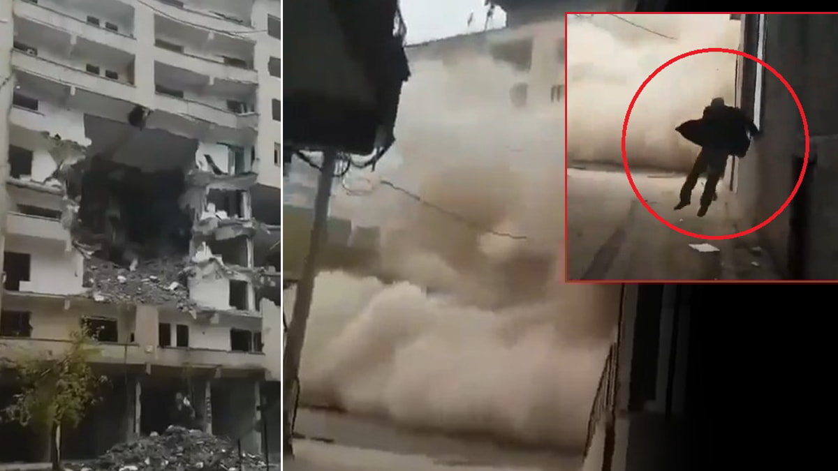 Bu sırada yere düşen kişi, ayağa kalkıp, üzerine doğru gelen toz bulutundan kaçtı. Binanın çökmesi ve kaçan kişinin o anları, cep telefonu kamerasıyla kaydedildi.