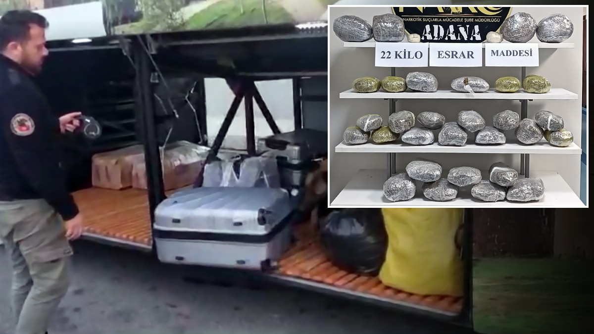 İl Emniyet Müdürlüğü Narkotik Suçlarla Mücadele Şubesi ekipleri, kente yüklü miktarda uyuşturucu getirileceği bilgisi üzerine harekete geçti. Polis, Tarsus-Adana-Gaziantep (TAG) Otoyolu’nda şüphe üzerine takibe aldığı yolcu otobüsünü, uygulama noktasında durdurdu. Otobüsün bagajında arama yapan narkotik köpeği ‘Hulk’, bir valize tepki verdi. Açılan valizde 300 gramı toz halde 22 kilo esrar ele geçirildi.