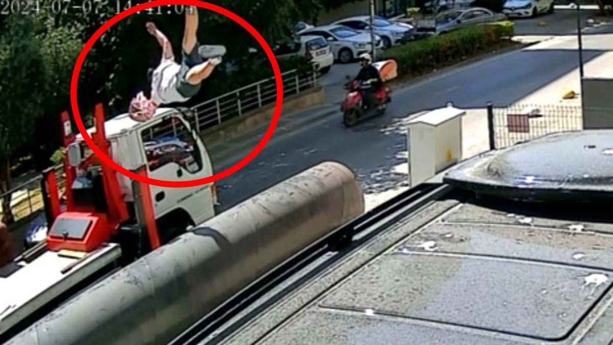 Yük asansörünün düştüğü anlar iş yerinin güvenlik kamerasına yansıdı. Görüntülerde, bir süre hareket eden asansörün bir anda düşmesi sonucu işçinin de düştüğü anlar yer alıyor. (DHA)